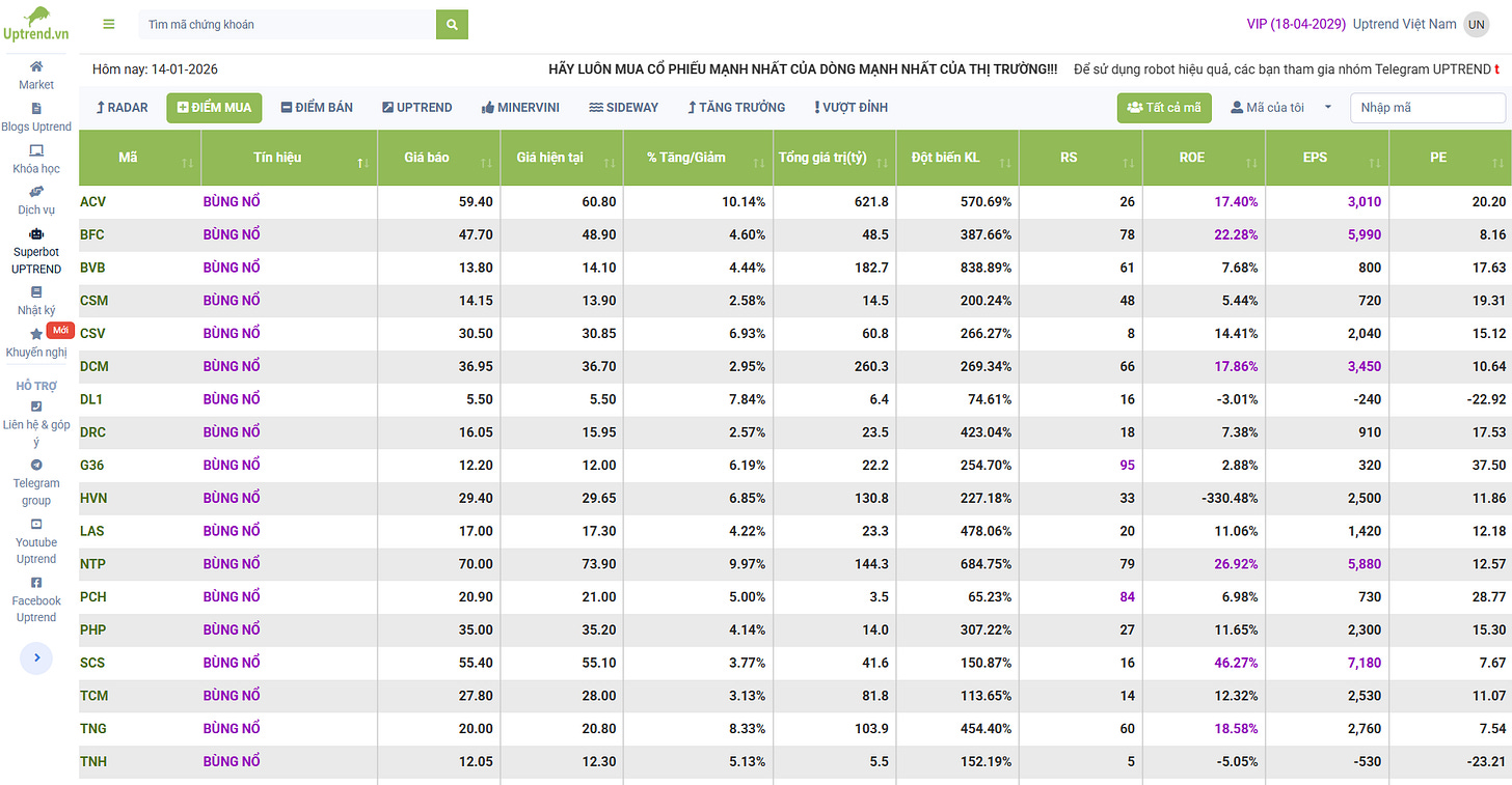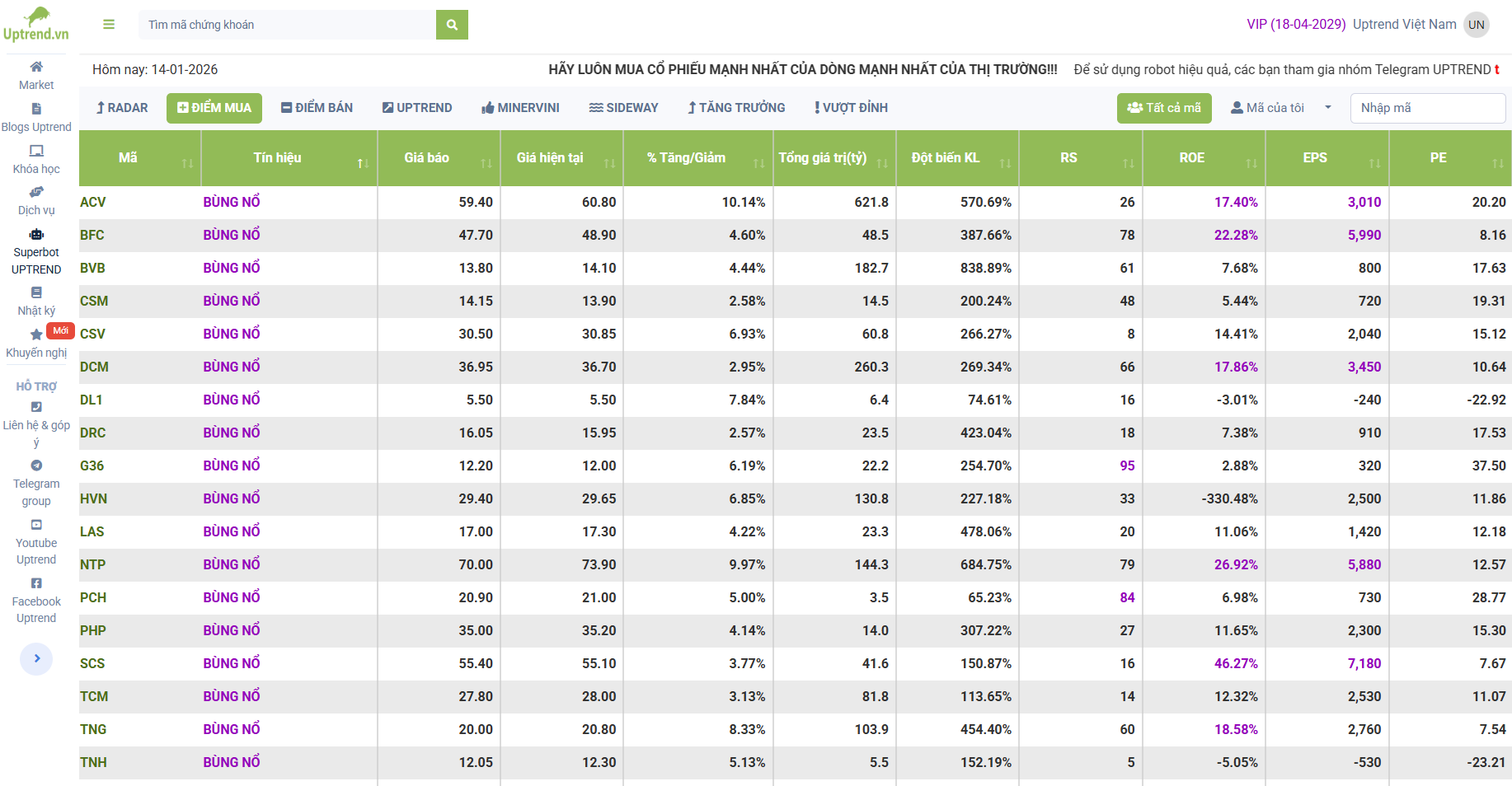Tổng hợp danh sách đáp ứng mẫu hình xu hướng ngày 15/1/2026