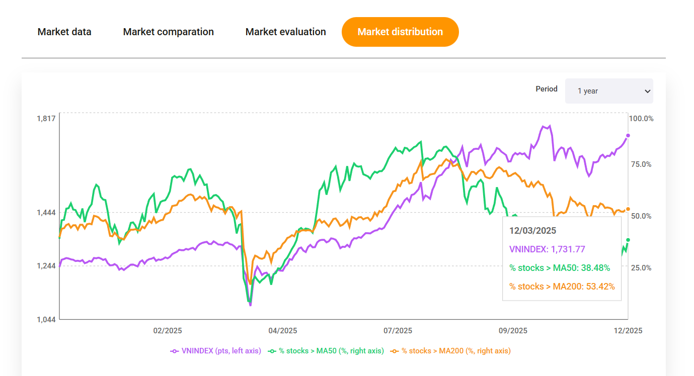 Biểu đồ Lan tỏa (Market Distribution) cho thấy dòng tiền Vốn hóa Vừa/Nhỏ vẫn ở mức Trung bình/Yếu (25-33). Tiền chỉ tập trung ở Bluechips (VN30).