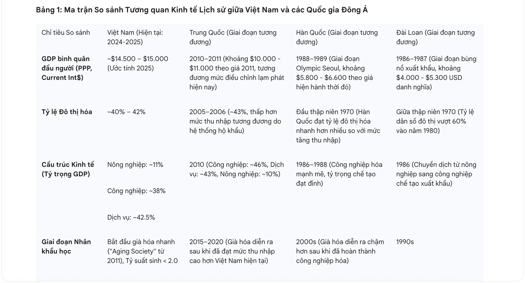 Chỉ tiêu So sánhViệt Nam (Hiện tại: 2024-2025)Trung Quốc (Giai đoạn tương đương)Hàn Quốc (Giai đoạn tương đương)Đài Loan (Giai đoạn tương đương)GDP bình quân đầu người (PPP, Current Int$)