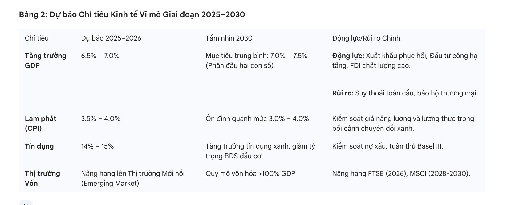 Bảng 2: Dự báo Chỉ tiêu Kinh tế Vĩ mô Giai đoạn 2025–2030