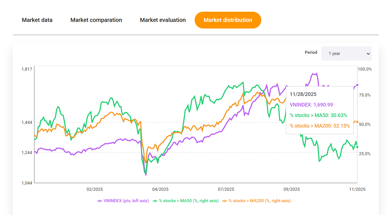 Chỉ số: Tỷ lệ cổ phiếu nằm trên đường MA50 (Đường xanh lá) chỉ đạt 30.63%.