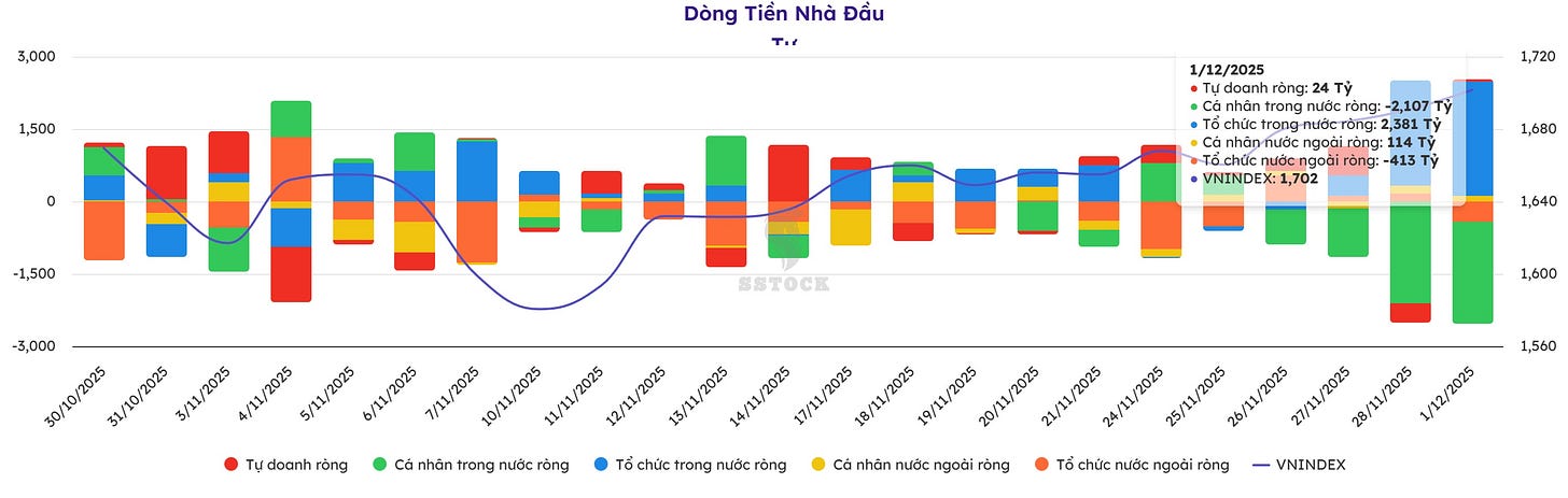 Mùa chốt NAV của các Quỹ (Window Dressing): (Giải thích cho Tổ chức mua ròng 2.381 Tỷ). Bước vào tháng 12, các quỹ đầu tư và tự doanh thường có xu hướng kéo giá hoặc gom mua các cổ phiếu Blue-chip (như VHM, VIC, MSN) để làm đẹp báo cáo tài sản cuối năm. Đây là động lực đỡ giá chính trong ngắn hạn.