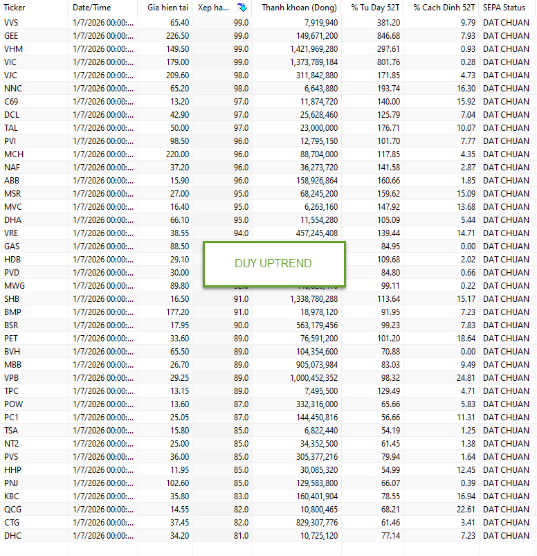 Tiêu chí: RS > 80 + Được tổ chức gom ròng + Vừa thoát nền tích lũy.