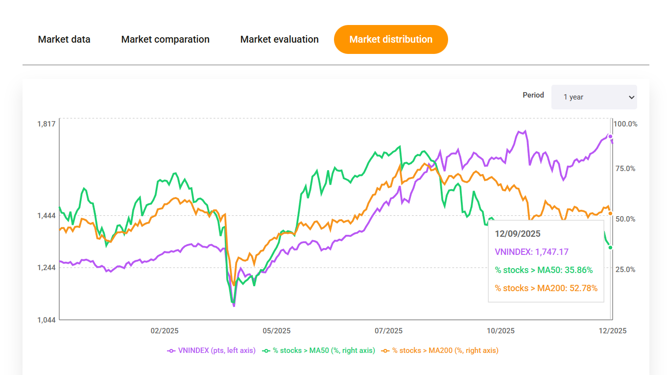 Sức khỏe nội tại: Tỷ lệ cổ phiếu > MA50 tụt xuống 34.94%. Xu hướng tăng ngắn hạn không bền vững, chưa thoát được trạng thái luẩn quẩn những ngày qua.