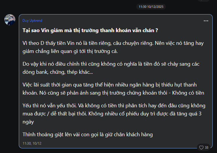 Bổ sung: TẠI SAO VIC GIẢM MÀ THANH KHOẢN THỊ TRƯỜNG VẪN KHÔNG CẢI THIỆN CHẢY SANG CÁC NHÓM CỔ PHIẾU KHÁC?