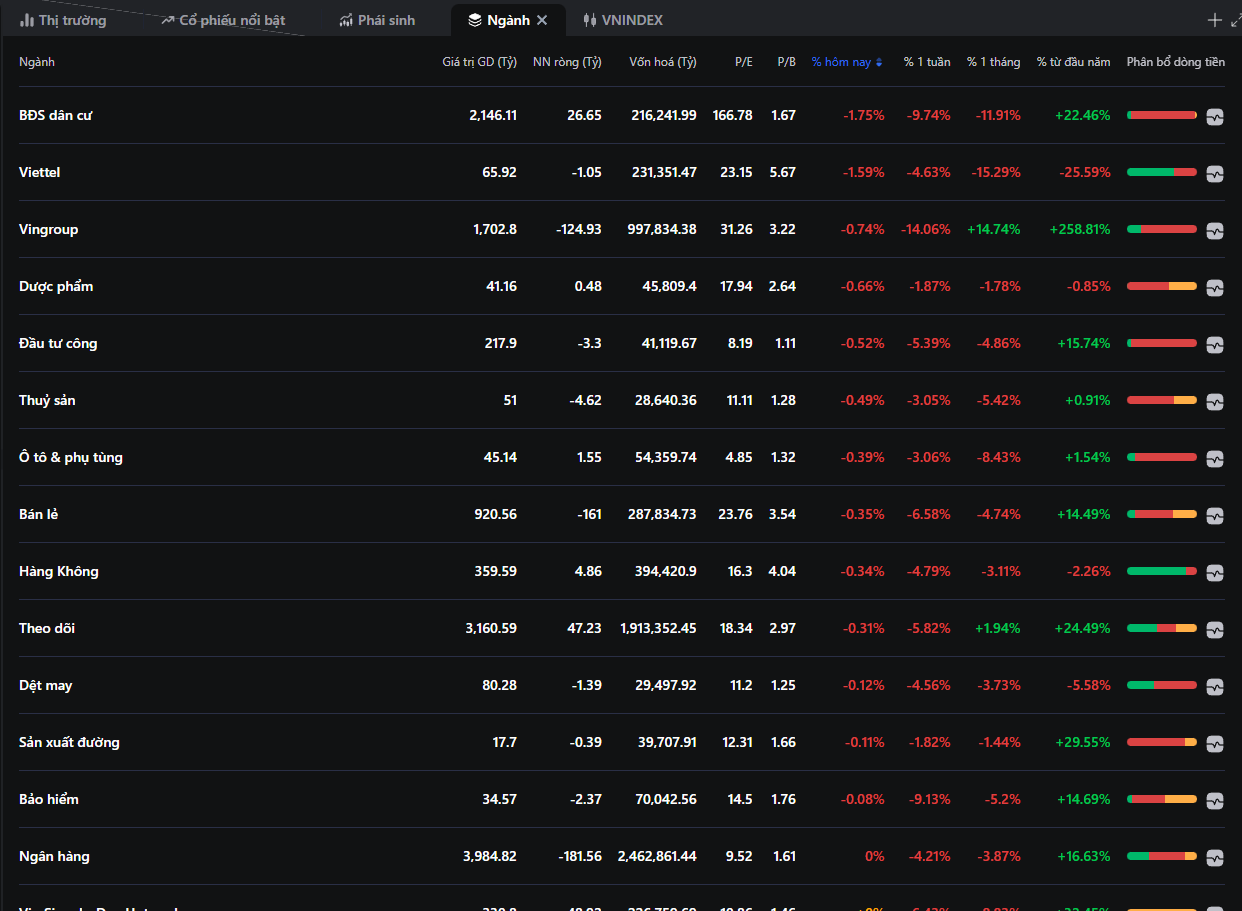Thực tế phiên 13/12: VN-Index đi ngang (-0.05%) nhưng rủi ro nội tại rất lớn khi nhóm Bất động sản tiếp tục giảm sàn/đỏ lửa.