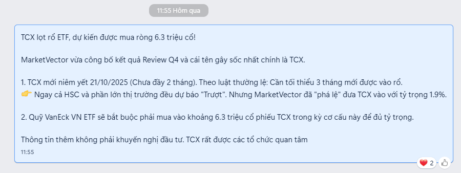 Thông tin về TCX: Lọt rổ ETF, dự kiến được muaròng 6.3 triệu cổ