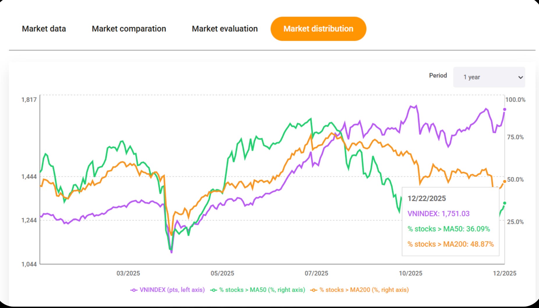 Tỷ lệ cổ phiếu > MA50 tăng vọt lên 36.09% (so với mức thấp ~25% các phiên trước). Xu hướng Uptrend đang dần được khôi phục.