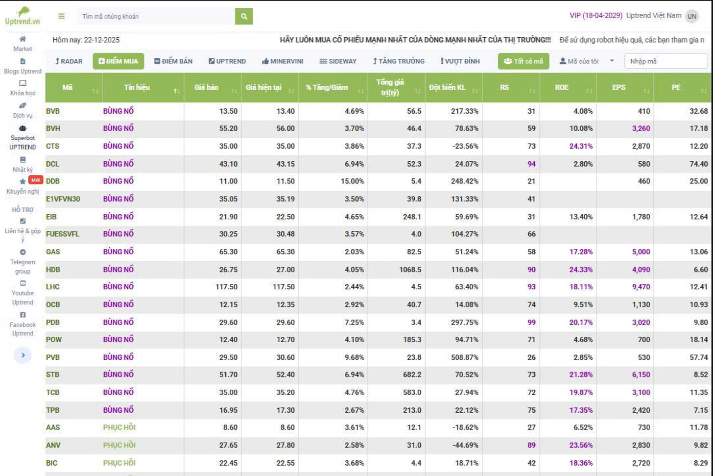 RADAR SĂN CƠ HỘI: Tiêu chí: Bùng nổ/Top dòng tiền + RS > 80 + Khối ngoại/Tự doanh ủng hộ.
