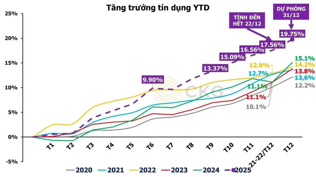 Tín dụng tăng tốc nước rút: Tính đến 22/12, tăng trưởng tín dụng đạt 17.56% và dự phóng đạt 19.75% vào cuối năm. Với mục tiêu GDP 8% và ưu tiên thúc đẩy tín dụng, nhóm Ngân hàng (đặc biệt là TCB, STB) là những doanh nghiệp hưởng lợi trực tiếp và lớn nhất.