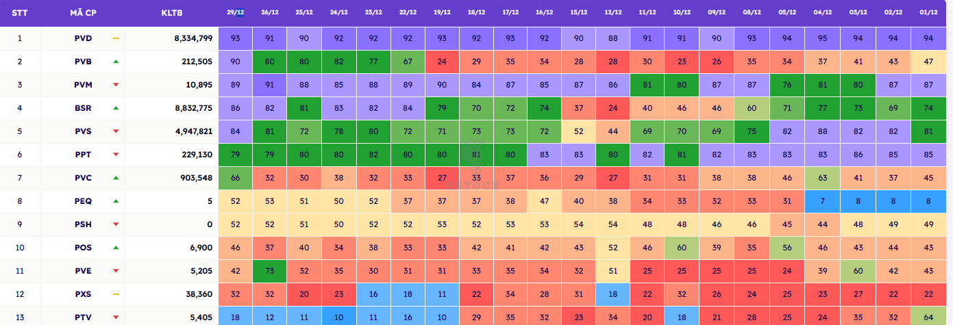 Mã tiêu biểu: BSR (RS 85), PVD (RS 90), PVS (RS 80) đồng loạt báo tín hiệu BÙNG NỔ hoặc vượt đỉnh 1-2 năm.