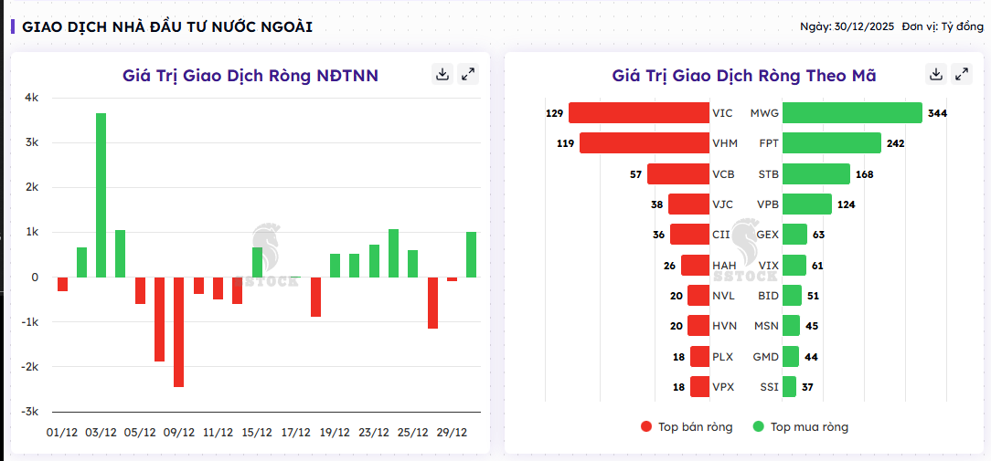 Khối ngoại: MUA ròng đột biến +982.9 tỷ. Tập trung gom tổng lực: MWG (+344 tỷ), FPT (+242 tỷ), STB (+168 tỷ), VPB (+124 tỷ). Đây là bệ đỡ cực lớn cho chỉ số.