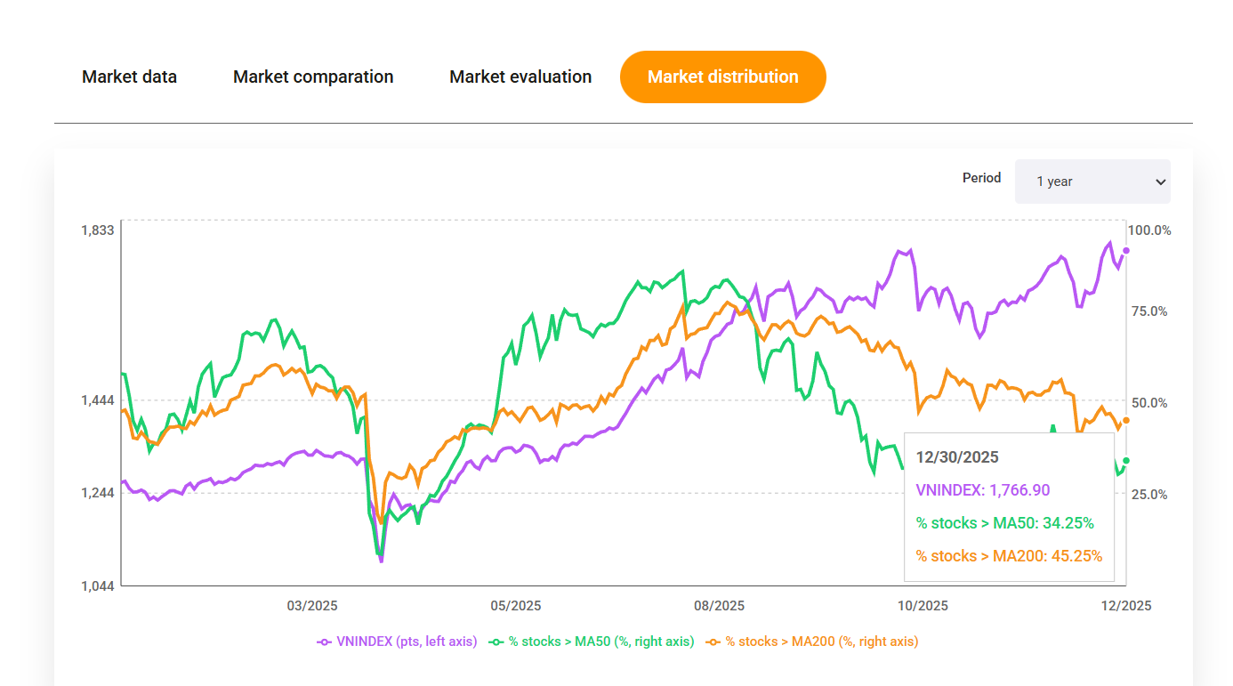 Tỷ lệ cổ phiếu > MA50 cải thiện lên 34.25% (so với 30.5% ngày 26/12).
