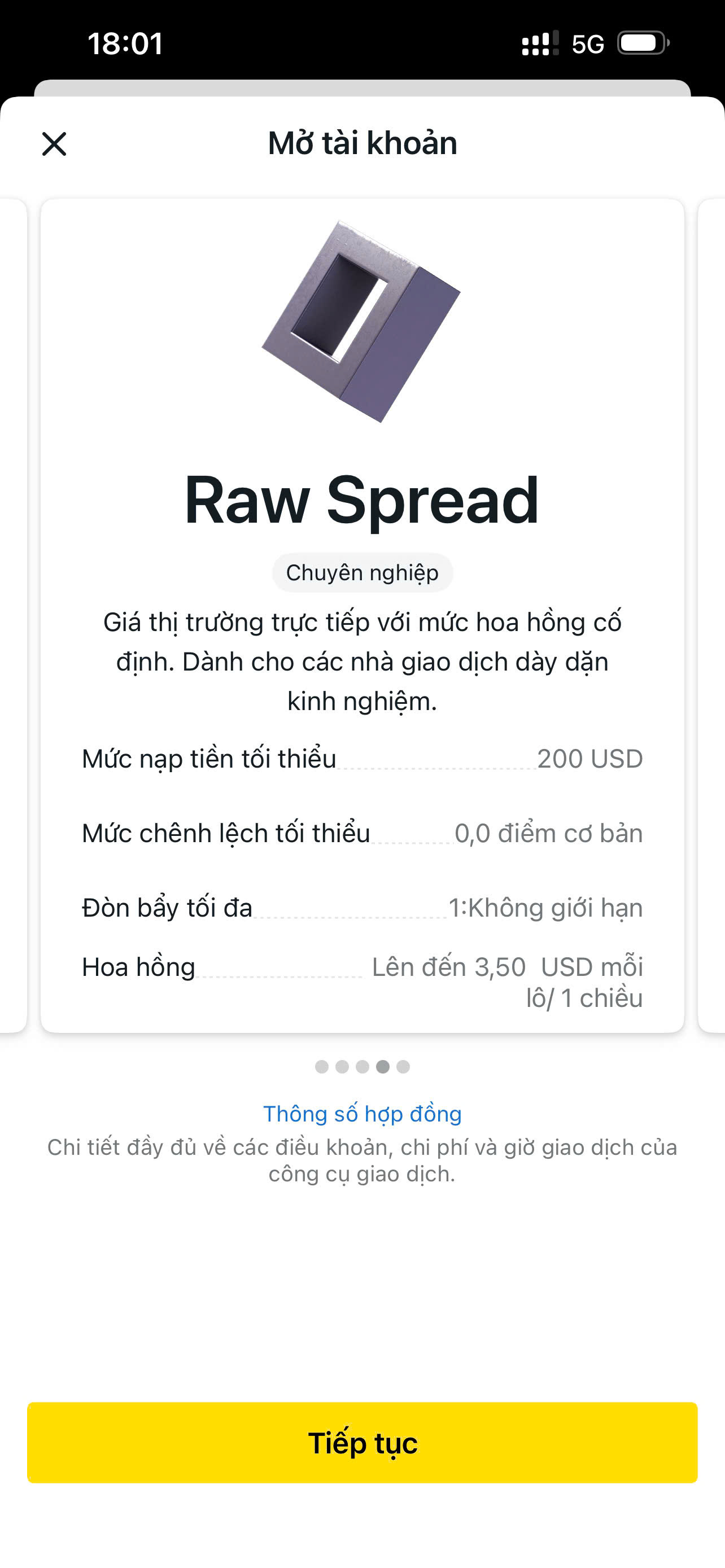 Bước 3: Mở tài khoản RAW (bấm nút chọn loại tài khoản thôi). Đây là loại tài khoản phí thấp nhất, gần như không có của Exness.