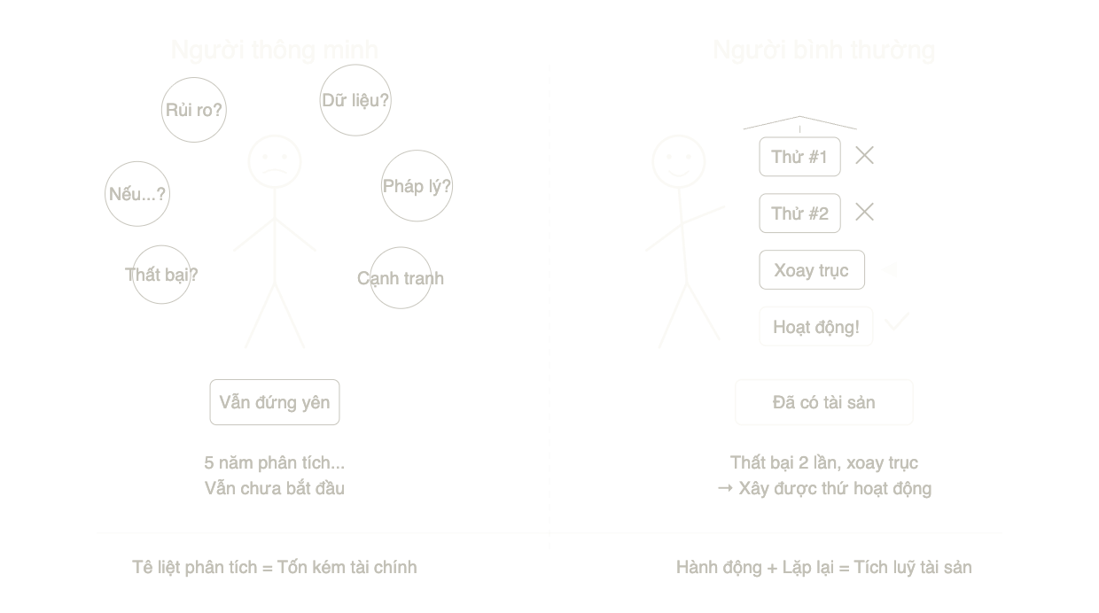 Người bình thường khởi nghiệp có thể không hiểu hết lý thuyết thị trường, nhưng họ sẵn sàng thử, thất bại, và thích nghi. Người thông minh có thể dành nhiều năm phân tích điều kiện thị trường, đọc báo cáo, so sánh dữ liệu, và xây mô hình lý thuyết. Trong khi đó, người bình thường đã khởi chạy, thất bại hai lần, xoay trục, và xây được thứ gì đó hoạt động được.