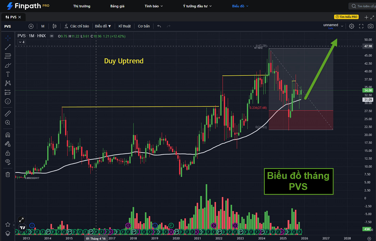 Biểu đồ tháng của PVS cho thấy giá điều chỉnh thường rất mạnh và đã hoàn thành chu kỳ điều chỉnh vùng giá 22 trước đó. Trong tháng 10 đã có cú quét giá về vùng giá 27. Với xu hướng tháng uptrend như hiện tại, PVS có khả năng sẽ đạt mục tiêu giá 50 trong tương lai với những tiềm năng như trên. Như vậy nếu thị trường điều chỉnh PVS về vùng 30 - 31 thì sẽ càng làm cho PVS là 1 cơ hội đầu tư tốt.