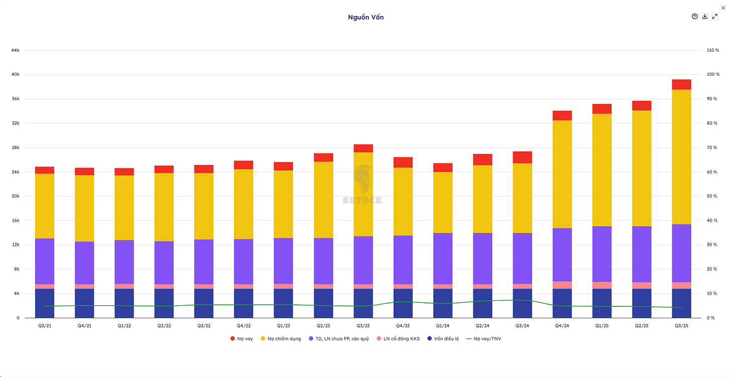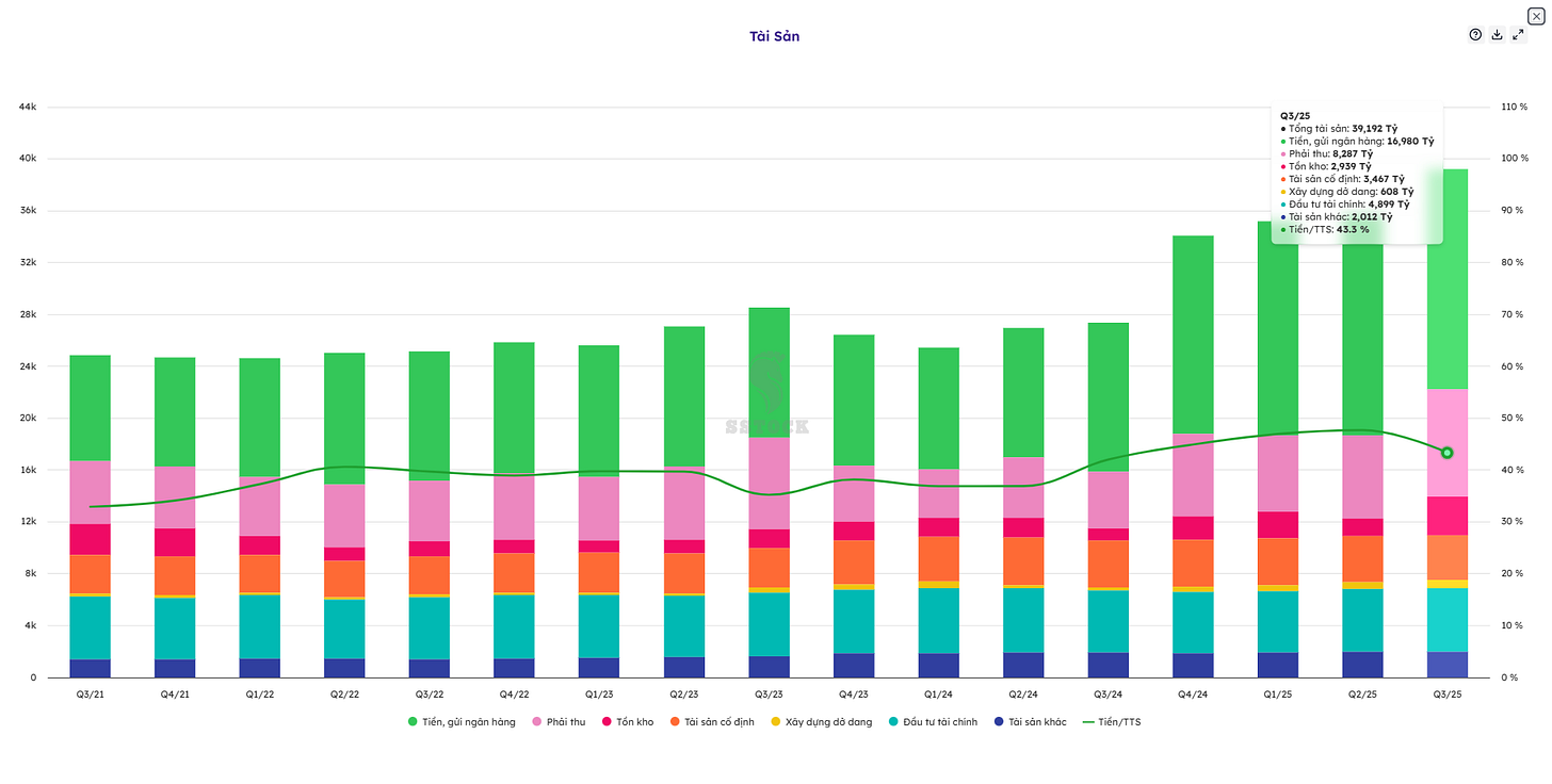 Cụ thể, tại cuối quý III/2025, PVS nắm giữ gần 16.800 tỷ đồng tiền mặt và tương đương tiền (bao gồm tiền, tiền gửi ngắn hạn), chiếm tới 60% tổng tài sản. Con số này đã tăng từ 16.500 tỷ đồng vào cuối quý I/2025 và tiếp tục tăng trong quý III. Trong khi đó, nợ vay tài chính của PVS chỉ ở mức rất thấp khoảng 1.646-1.700 tỷ đồng, tạo ra tiền mặt ròng (net cash) khoảng 15.300 tỷ đồng.